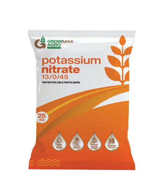 - Growmaxagro Potassium Nitrate is 100% water soluble imported, with best quality suitable for all Crops. Combined nutrient of Nitrogen and Potash is available fully for the plant.