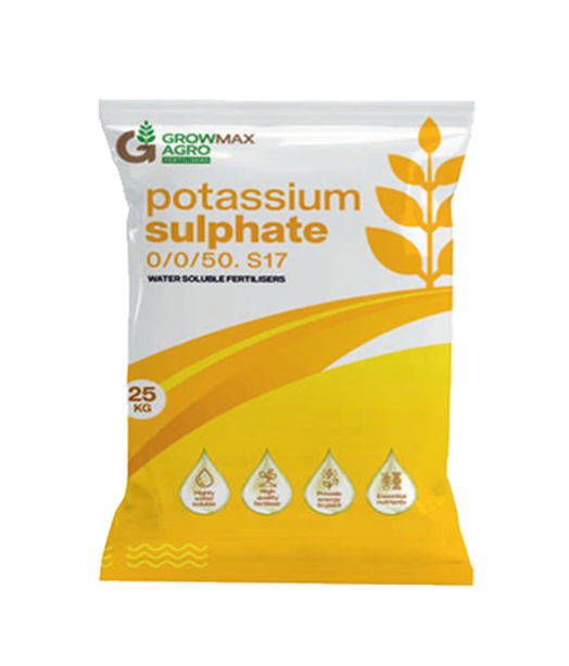- Growmax Potassium Sulphate: 100% Water-Soluble and suitable for all crops. Growmax Potassium Sulphate is a adaptable and eco-friendly water-soluble fertilizer rich in potassium and Sulphur. It enhances crop quality, promotes post-harvest yield preservation, and boosts disease resistance, all while being cost-effective and safe for the environment.